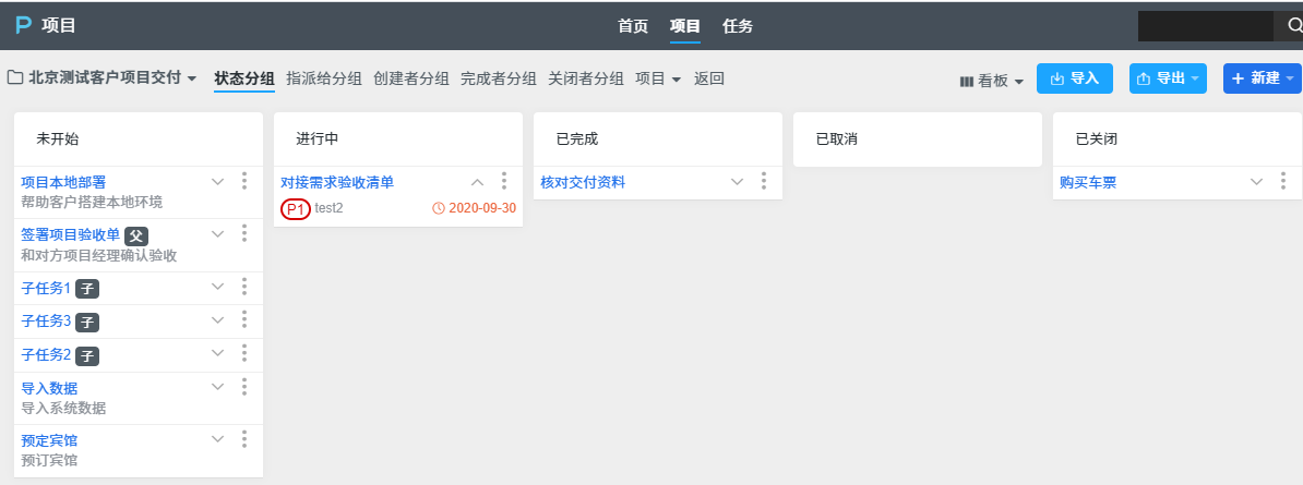 - 看板视图中的任务可以拖拽。比如将任务从”未开始“栏拖拽到”进行中“,相当于做了开始操作。