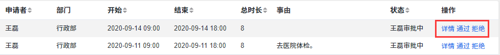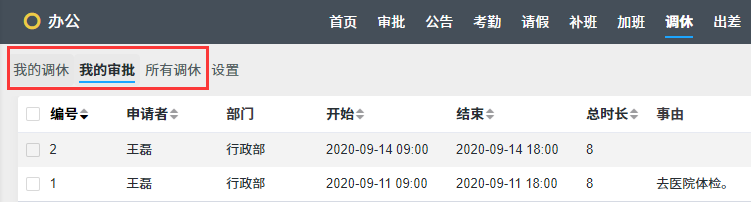 部门经理 可以通过 “我的审批”列表标签查看需要自己审批的调休申请,通过“所有补班”标签查看公司所有部门的调休记录 , 并予以通过或拒绝。