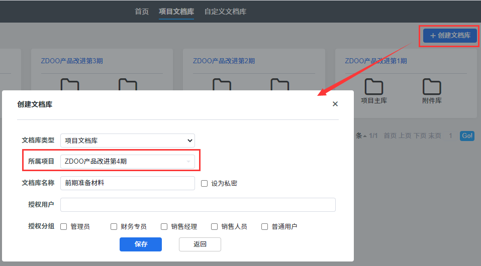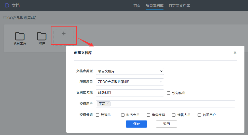 管理文档,第一步就是要创建文档库。单击文档模块界面右上角的“创建文档库”按钮,弹出文档库创建窗口,设置文档库的分类、名称,如果是项目文档库,则要选择归属哪个项目,支持文档库授权权限设置。