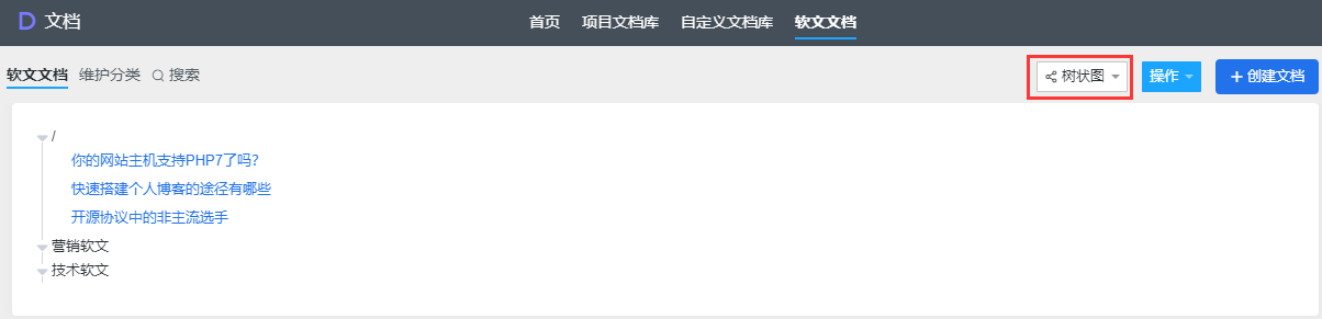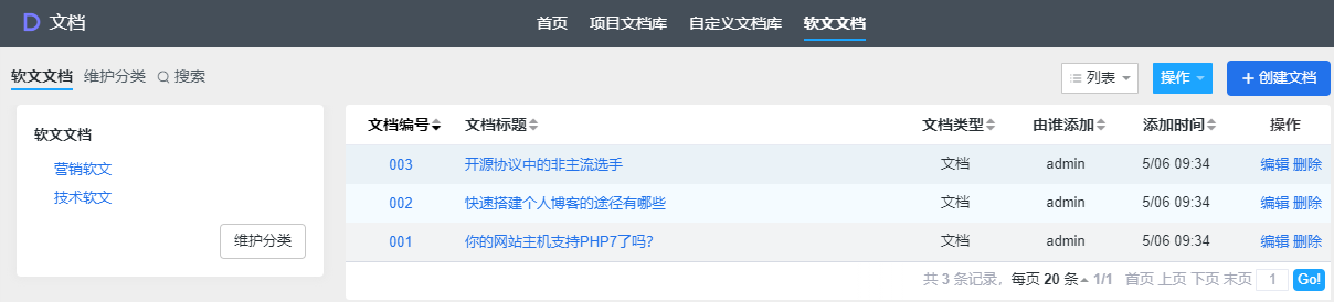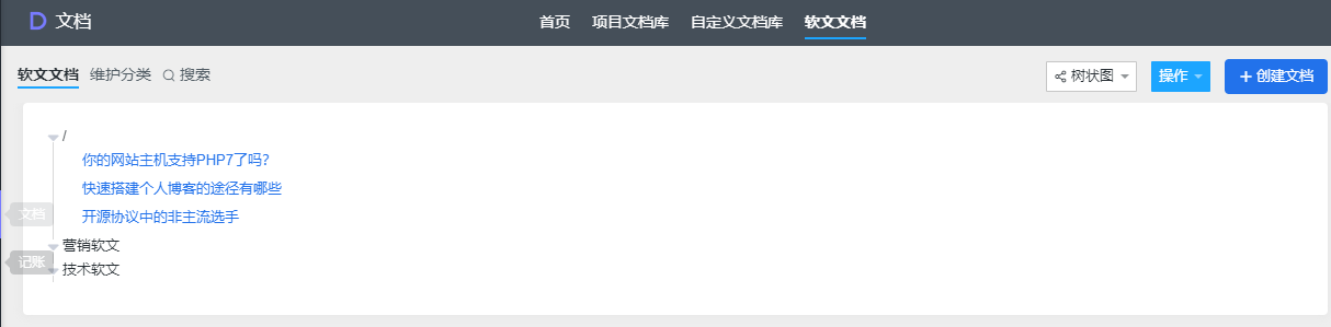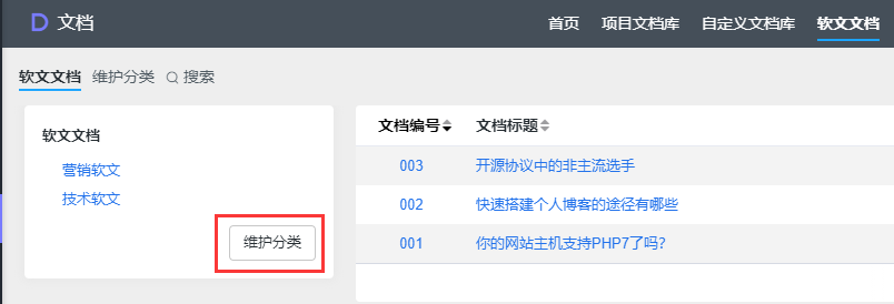 创建文档之前,要先维护分类,以便于对文档进行分类管理。进入某个文档库,点击左边的“维护分类”按钮即可。分类支持子分类设置,并可以自定义拖动排序,简便灵活。