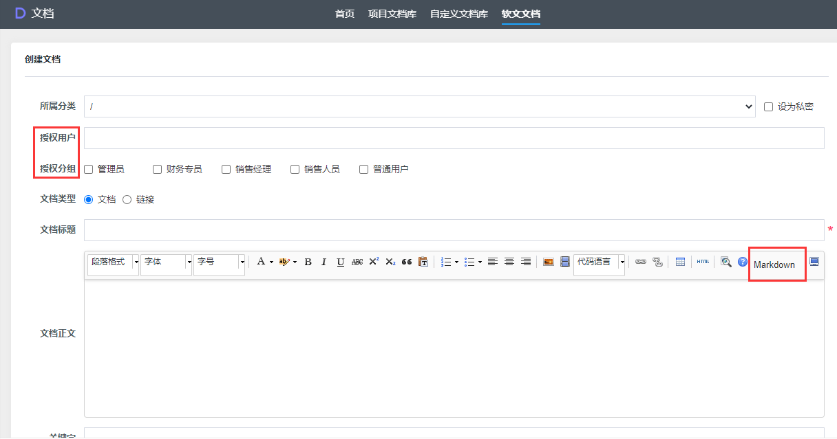 单击右上角的“创建文档”按钮即可进入文档创建页面, 创建文档时支持Markdown,编辑器使用ueditor。