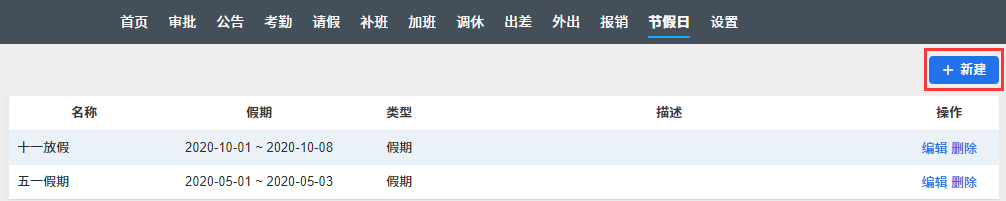 在 节假日页面右上角有 新建 按钮。