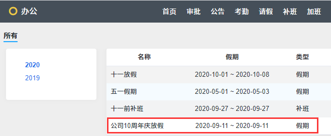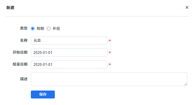 节假日管理,可以添加假期和补班两种类型。
