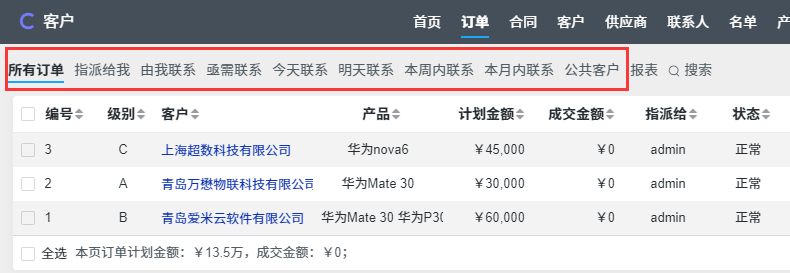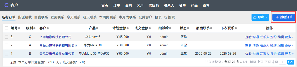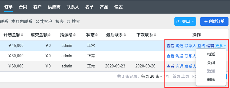 有了客户之后,就可以通过订单来进行跟踪了。订单的主要操作有创建、沟通、指派、查看详情、指派、关闭、激活等操作。