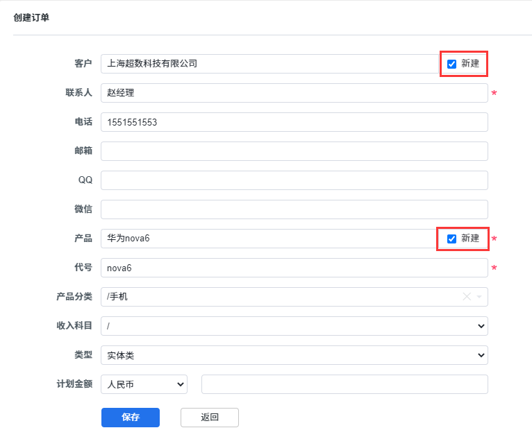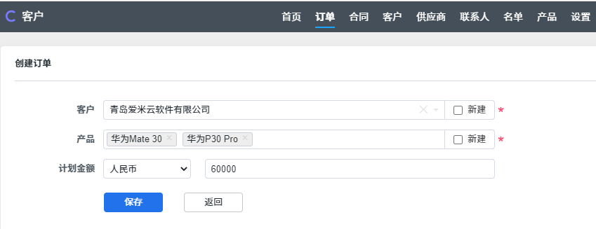 创建订单的时候需要选择客户、产品,如果有初步的计划金额的话,也可以把金额填上。