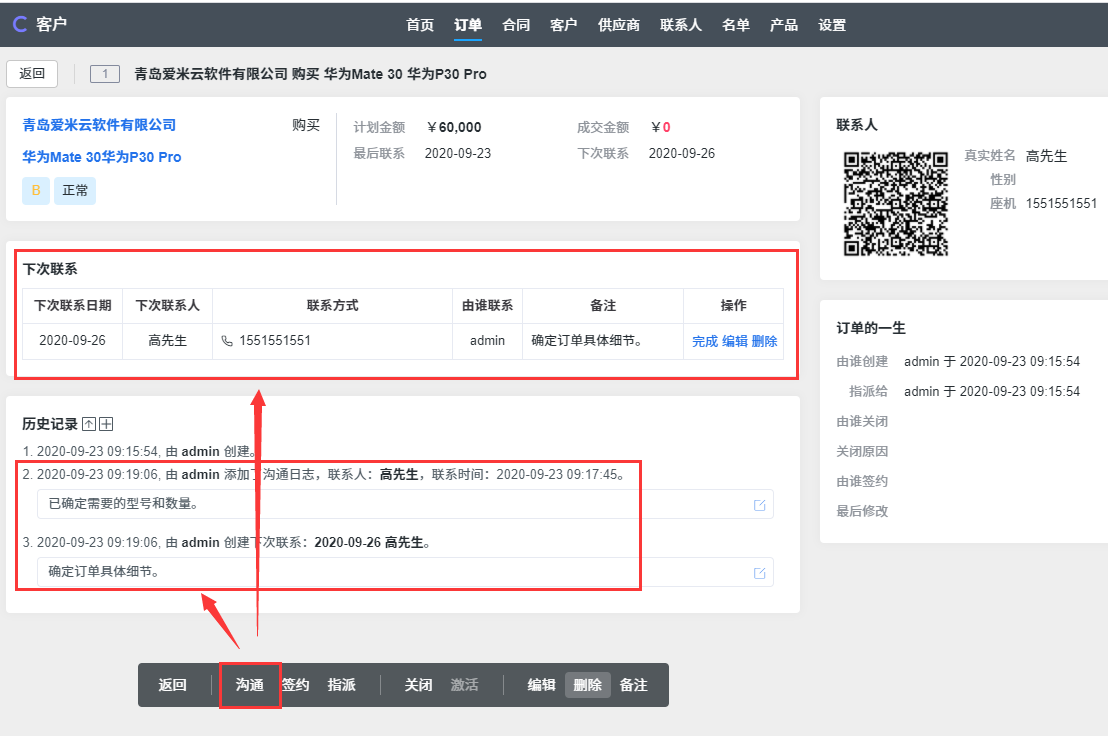 添加订单的沟通记录,可以添加本次沟通的记录,还可以添加下次联系的联系人,由谁联系,联系日期以及备注信息。