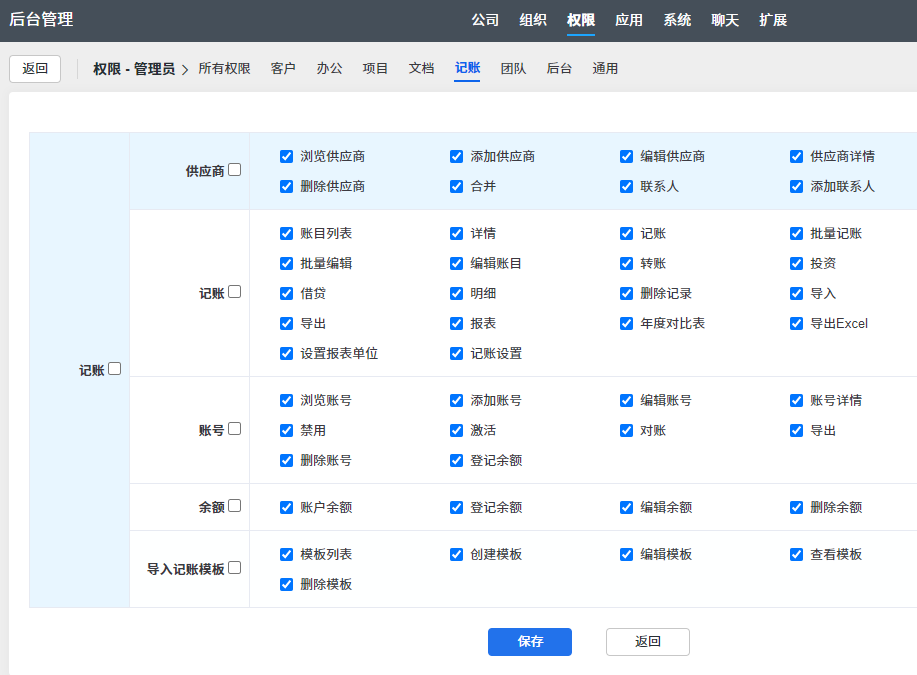 1.默认只有超级管理有全部操作的权限,需要在后台管理的权限页面中给其他成员设置记账应用的权限。