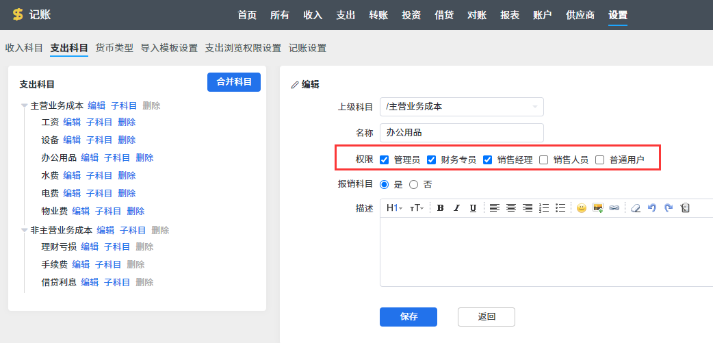 后台管理中可以对记账应用的操作权限进行管理;记账应用的设置中可以 设置支出的浏览权限,也可以 基于支出科目设置浏览权限。