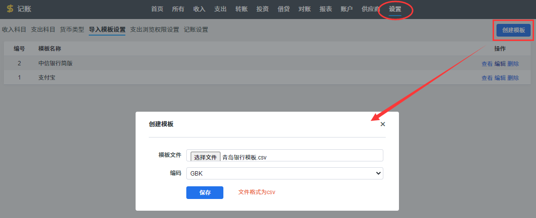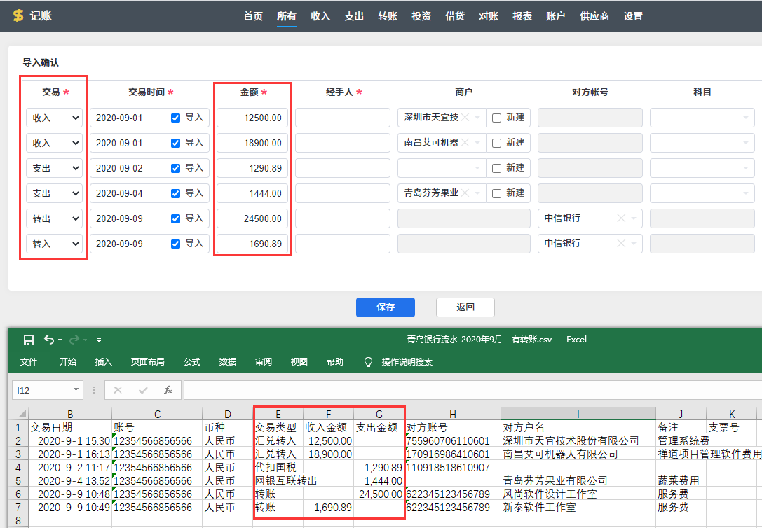 2.导入记账数据,支持导入收入、支出和转账的交易记录。