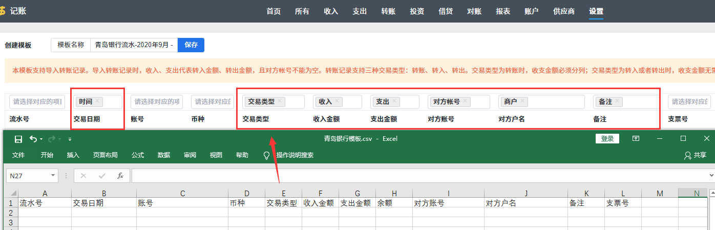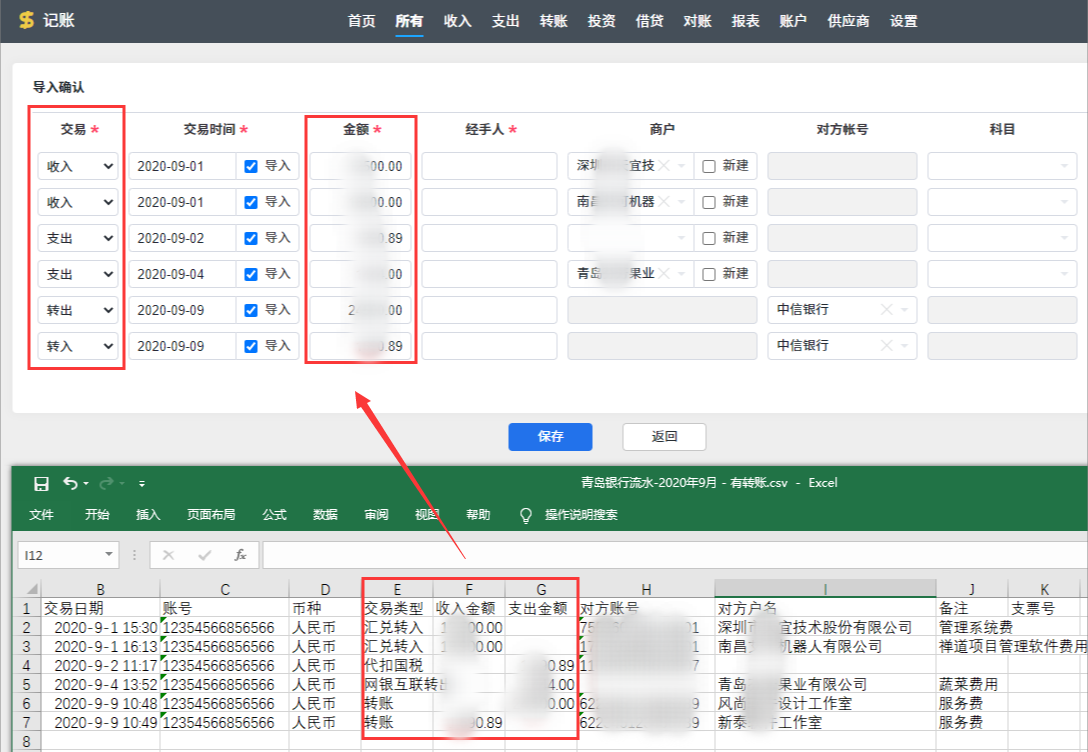- 导入转账记录前,需要根据导入模板中收入/支出“是否分列”将电子版对账单中转账记录的交易类型修改为转出、转入或转账。如果导入模板中设置了收支分列,那么交易类型填“转账”;如果导入模板中未设置收支分列,那么交易类型填“转出或转入”。
