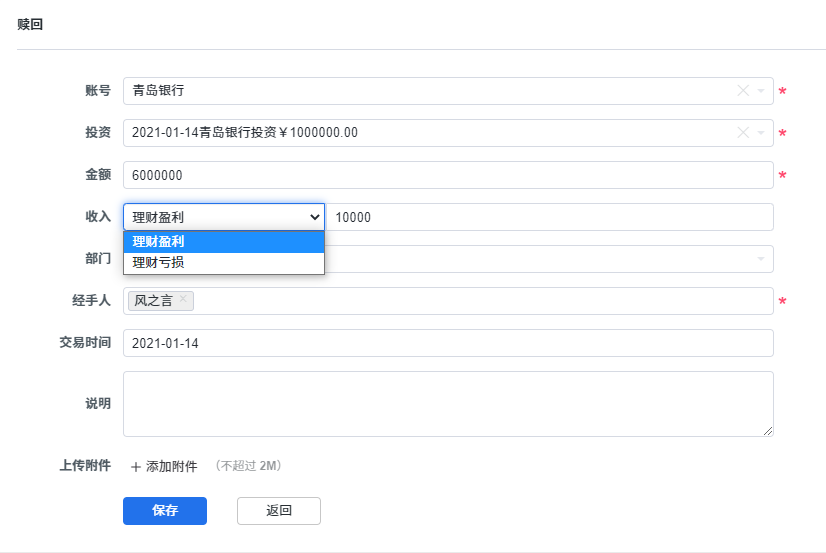 如果本次赎回时有盈亏,还可以在收入项中记录盈利/亏损的具体金额。