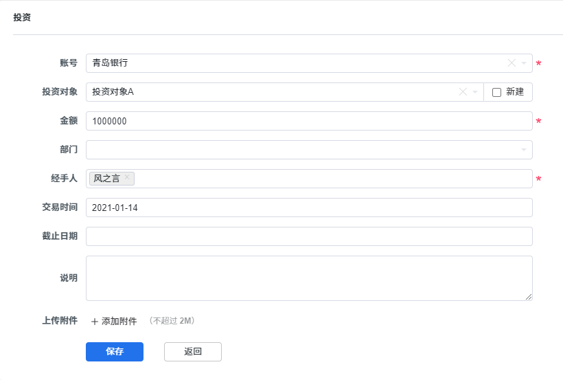 记投资时,如果没有可选择的投资对象,可以“新建”投资对象,新建后可在供应商中查看。