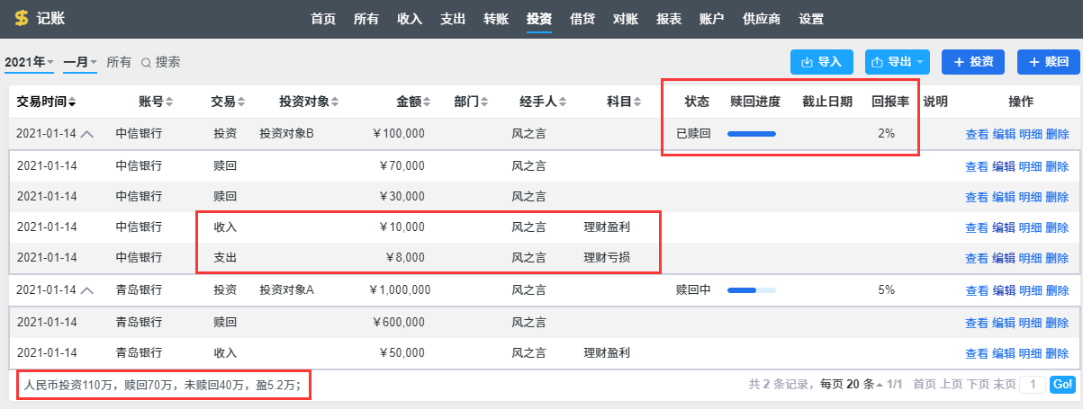 记账应用中可以记投资和赎回,查看赎回状态、赎回进度、回报率和投资的盈亏情况。