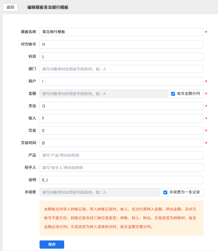 - 交易类型为转账时,收支金额必须分列;交易类型为转入或者转出时,收支金额无需分列。