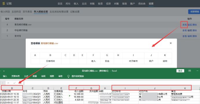 导入记账之前,需要先根据银行或者支付宝的导出文件创建导入模板。