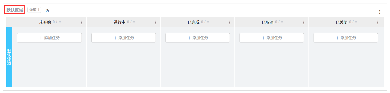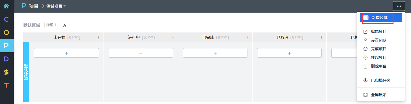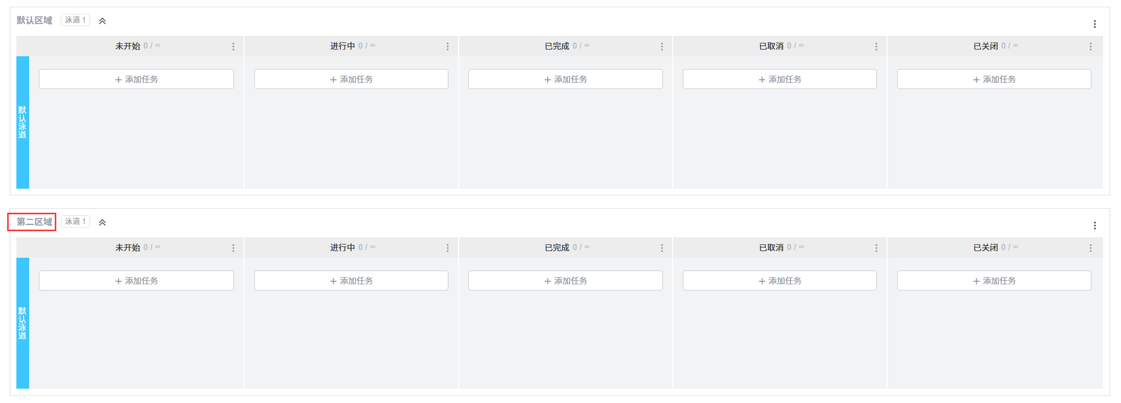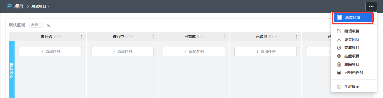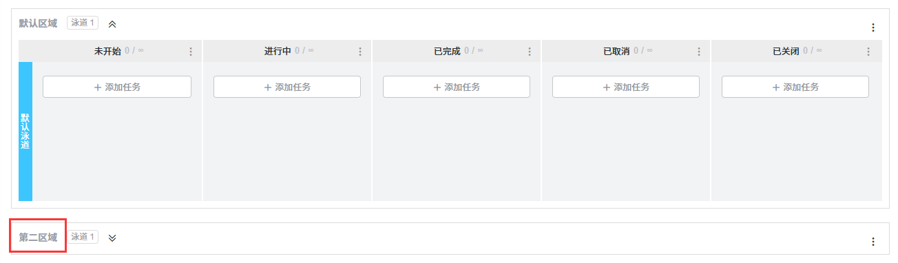 ZDOO的看板项目引入了区域的概念。 在创建看板项目时会默认一个区域,也可以添加多个区域。