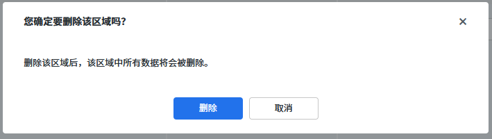 点击区域更多菜单中的【删除区域】选择项,弹出删除区域确认页面,点击【删除】区域删除成功。点击【取消】或关闭按钮则取消删除区域。