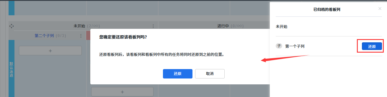已归档的看板列均在列表中显示。点击列表中看板列对应的还原按钮,点击【还原】后弹出确认还原弹窗,点击【还原】看板列还原,显示在归当前的位置。点击【取消】则取消还原。