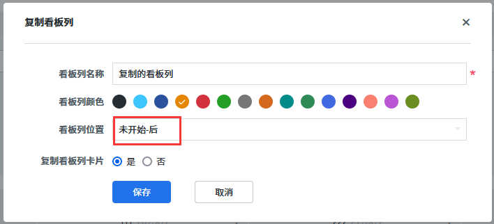 与添加看板列不同,复制看板列操作会复制当前看板列的名称及颜色。复制看板列卡片字段勾选【是】,当前看板列中的任务卡片也会一并复制。选择看板列位置后点击【保存】即可复制看板列到选定位置。