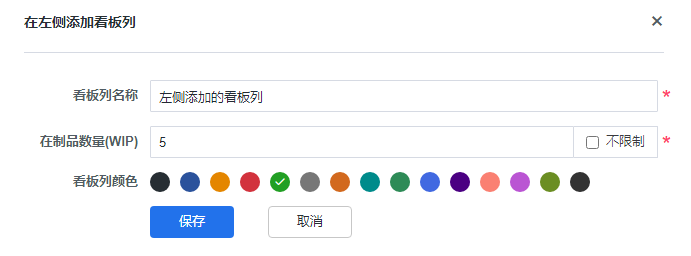 点击【在左侧添加看板列】弹出确认添加看板列弹窗,可以填写看板列名称、在制品数量及设置看板列颜色。