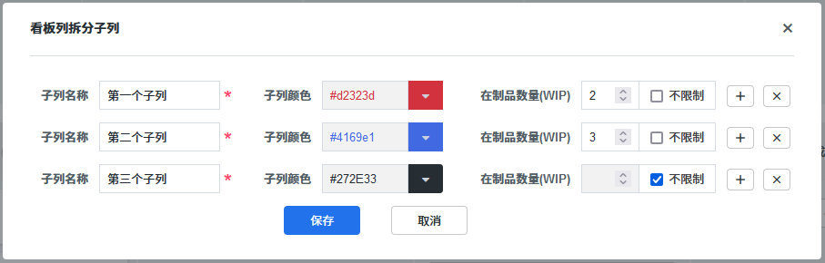 看板列及子列均可设置在制品数量。在制品数量是指当前看板列中可以承载任务卡片的数量。