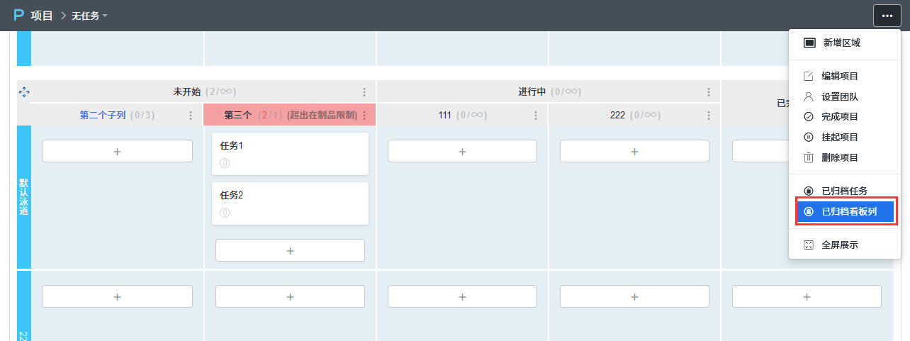 归档后的看板列还可以查看和还原。点击项目的设置菜单【已归档看板列】展开已归档看板列列表。