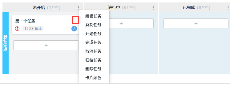 对任务的操作也可通过点击任务卡片右上角的更多操作选项(鼠标悬浮显示), 编辑、开始、完成、取消、删除等操作同详情页中一致。