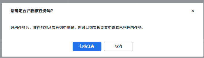 除此之外,任务也可以归档。点击【归档任务】选项,弹出确认归档的弹窗。点击【归档任务】则任务归档成功,当前看板列中不再显示该任务。点击【取消】则取消归档任务。