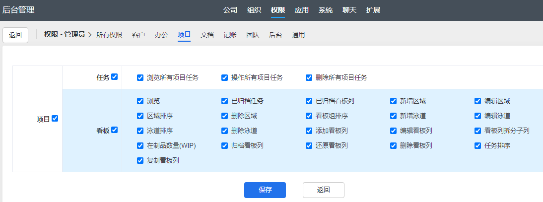 后台权限设置中,在原权限的基础上,新增了看板项目的操作权限。