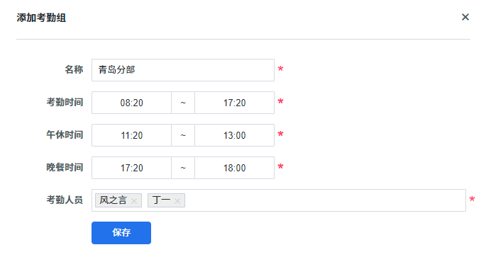 添加考勤组时,可以设置考勤时间、午休时间和晚餐时间,然后选择需要用该考勤时间的人员。保存考勤组后,考勤组立即生效。