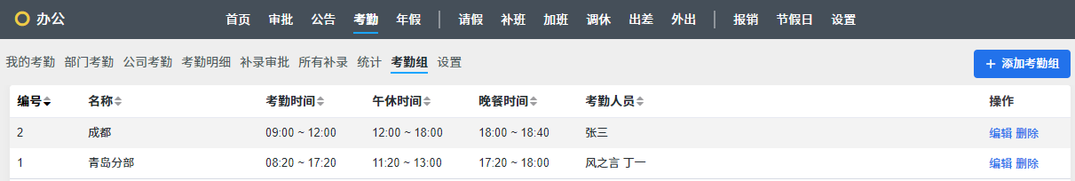 当公司有不同班次的管理需求时,人事可以根据公司的考勤要求添加不同的考勤组,每个考勤组都可以设置考勤时间和考勤人员。