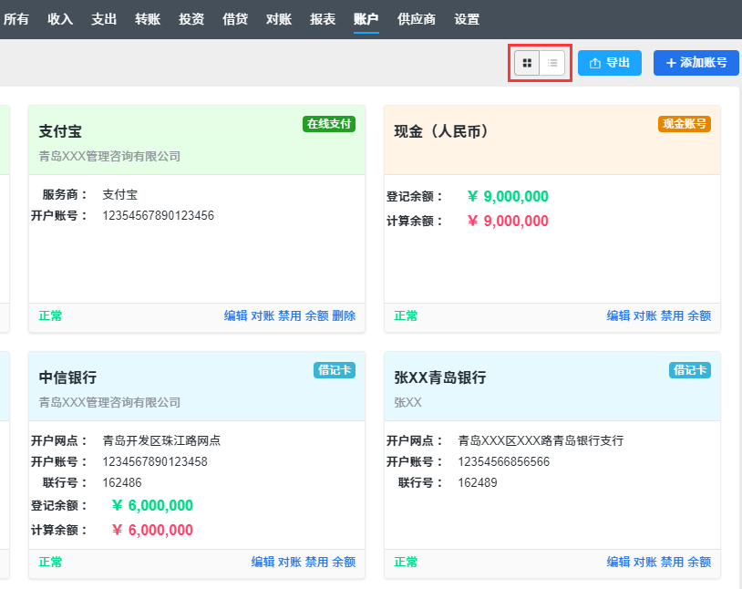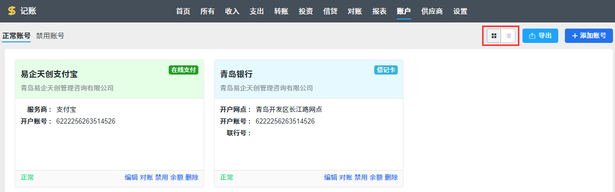 账户有“ 正常”和“ 停用” 两种状态,账户页面默认以卡片形式显示所有“正常”状态的账号。