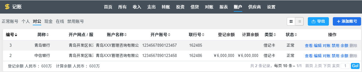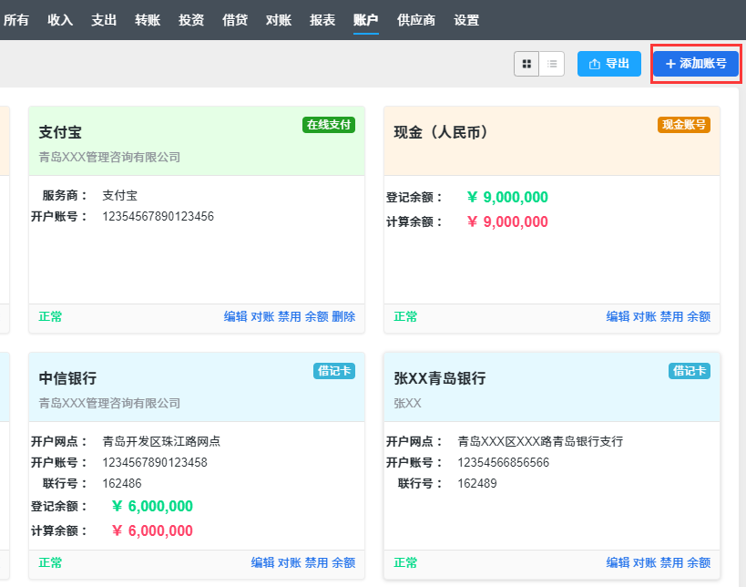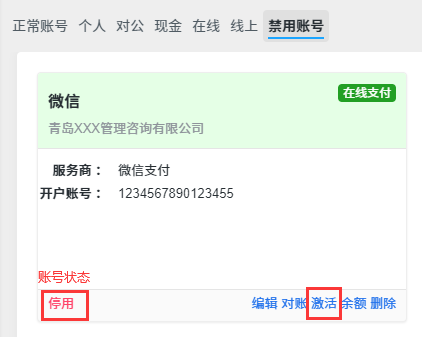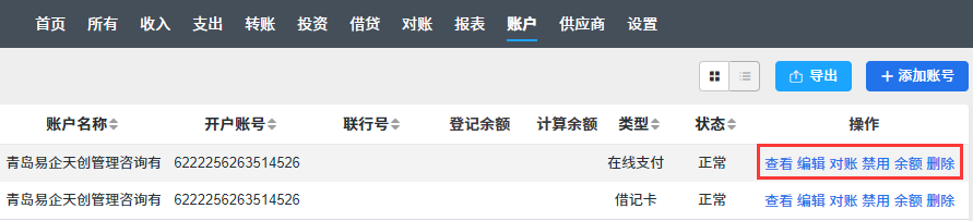 财务人员可以对账号进行添加、编辑和删除的常规管理之外,还可以禁用/激活账号、登记余额和对账。