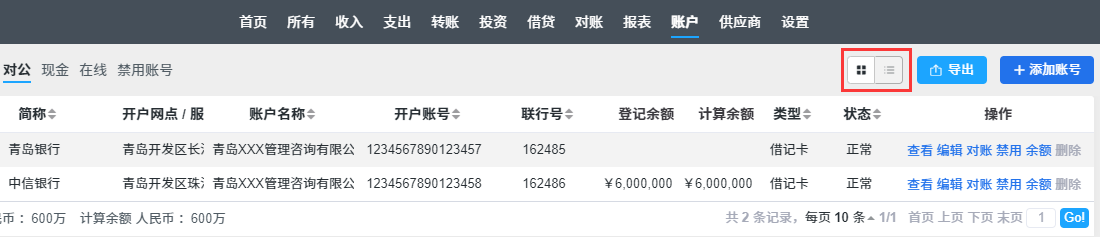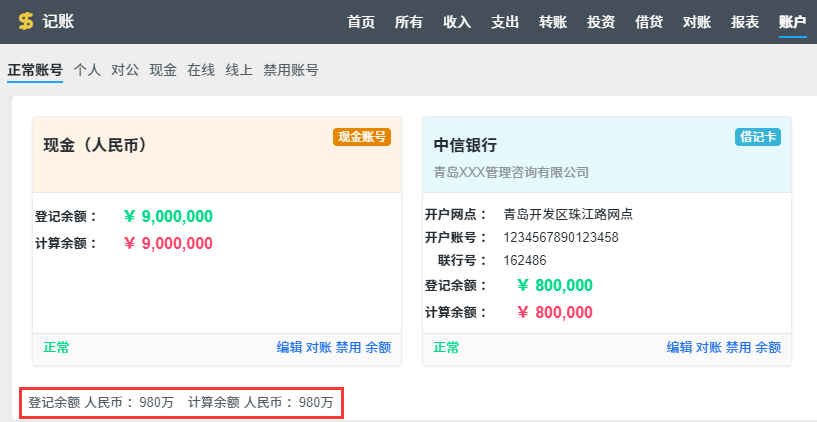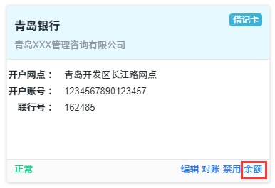 我们可以看到每个账号的余额和基本信息(开户信息、账号类型、账号状态等),还可以在底部看到所有账号的总余额。