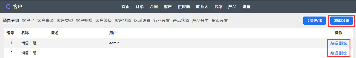销售分组的添加维护,需要在后台→权限→客户里分配销售分组相关权限。