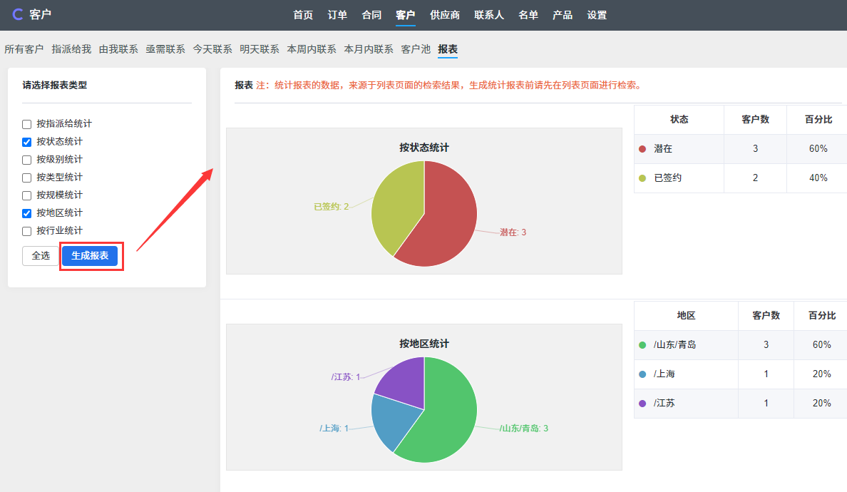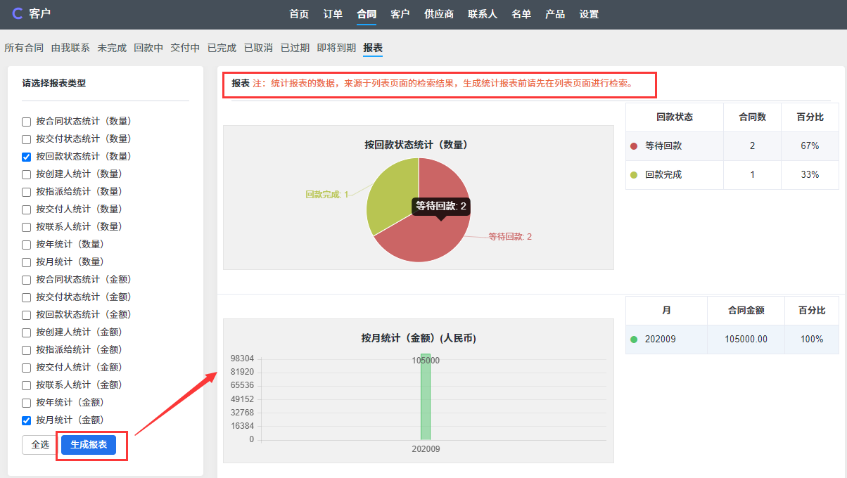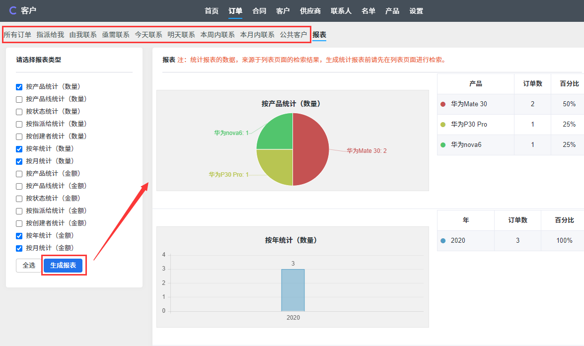 注:订单、合同、客户 可以先搜索,然后再点击 报表 按钮,这样报表会只针对搜索的结果进行统计。