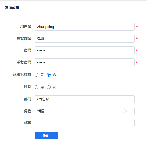 根据下图,填写好基本信息,点击保存即可。如需更改信息,可以直接在成员列表里做编辑操作。