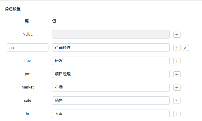 注:角色的 “键” 的变量名和 “值” 的自定义显示值 都必须填写,保存后才会自定义角色成功。