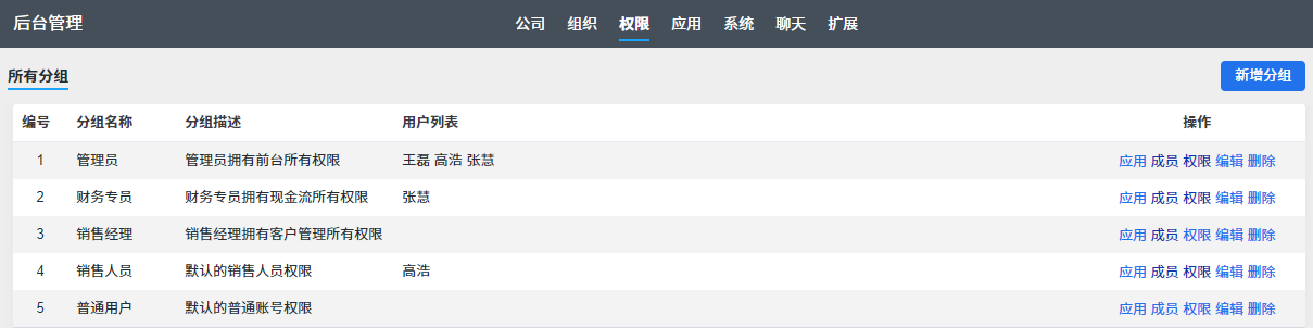分组操作里有应用、成员、权限、编辑、删除操作,可以根据实际工作需要做编辑和调整。