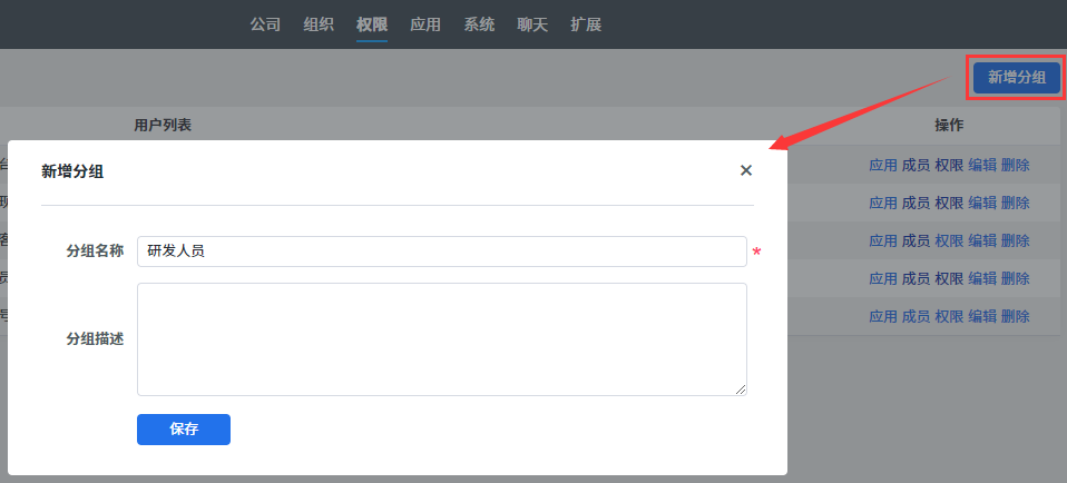 1.权限页面右上角点击 新增分组 按钮,在跳出的对话框里填写好分组名称、分组描述,然后点击保存即可。
