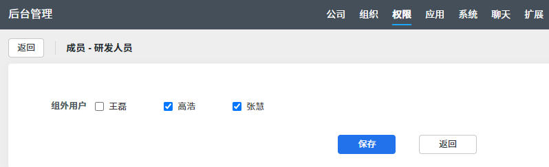 超级管理员可以在后台管理→权限里编辑权限分组信息;也可以添加权限分组,给分组添加授权应用、添加分组成员、分配权限等操作。
