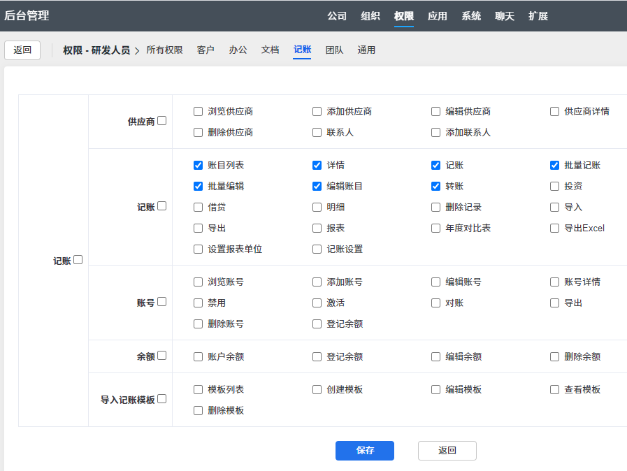 2、基于数据的权限控制,根据查看的数据进行权限判断,主要包括客户的销售分组、记账的支出浏览权限、博客/文档的访问权限控制。