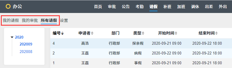 部门经理可以在这个页面里查看到本部门的所有请假申请。