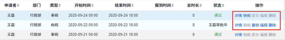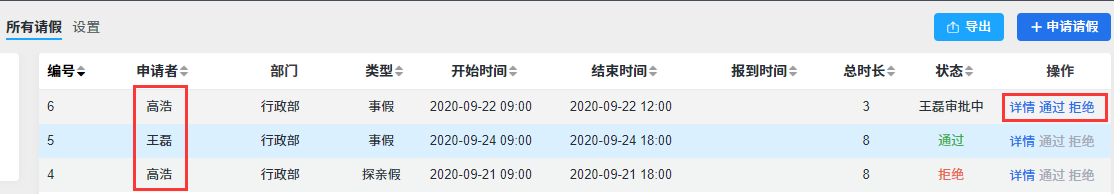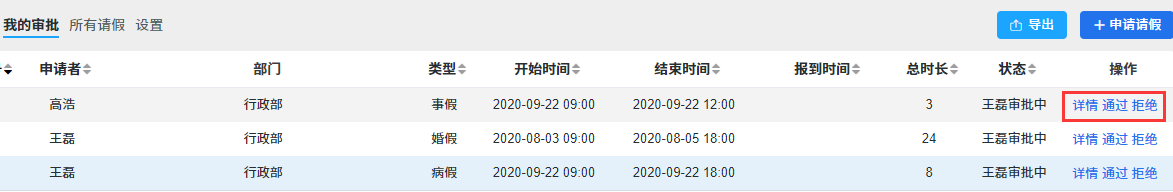 在这个页面,可以查看到公司所有的请假情况。