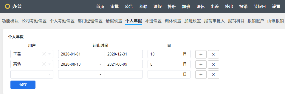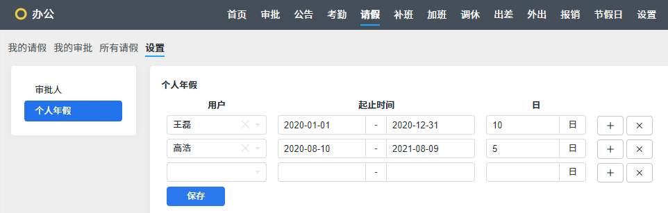 到 日常办公--请假--设置--个人年假,可以设置某个用户,在某个时间段内的年假天数。