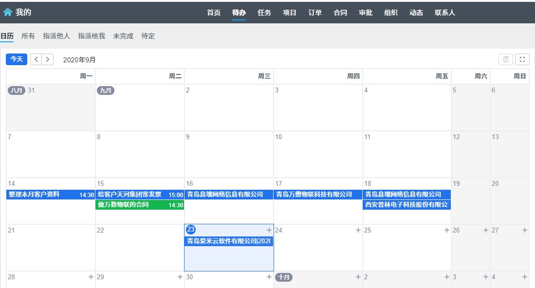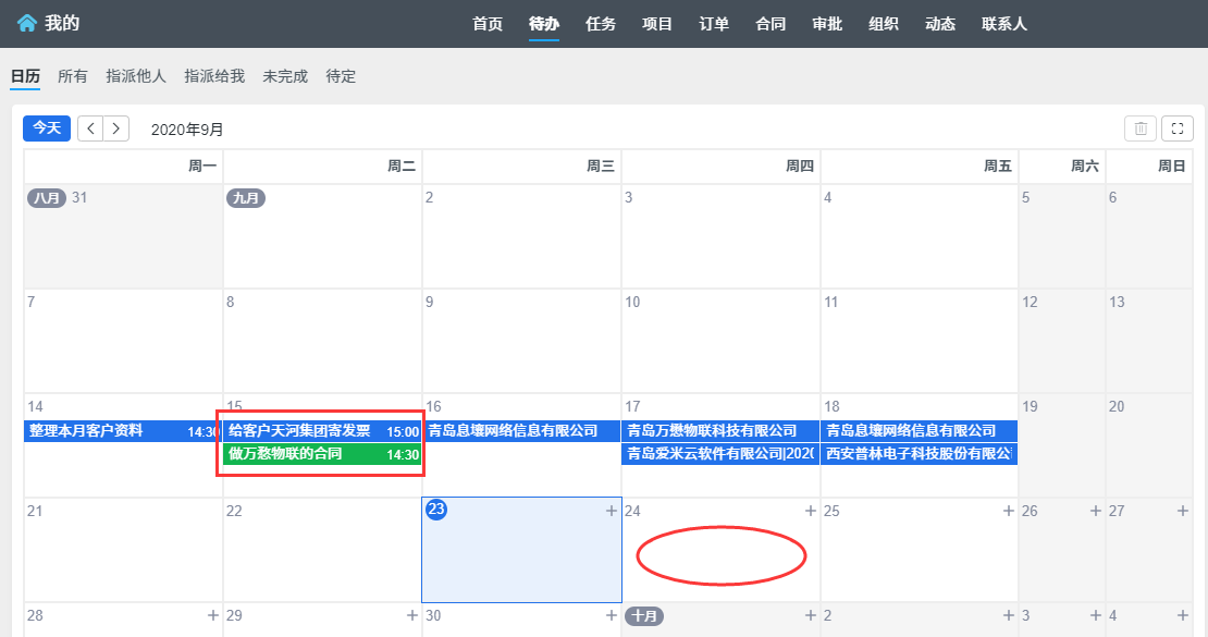 在待办页面,你可以创建待办事务,也可以把右侧的待定事务、项目任务、要跟进的订单和客户,拖到左侧的日历具体日期上。