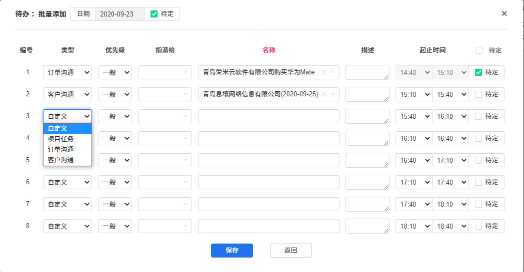 直接从下拉菜单里选择即可。这个操作与从待办右侧的任务、订单、客户下直接拖拽事务到待办日历上是一样的效果。