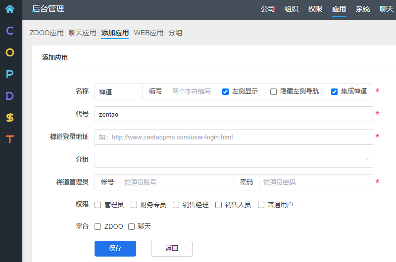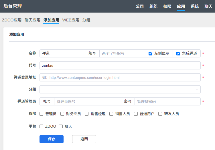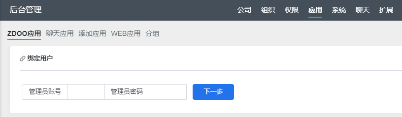 使用ZDOO超级管理员登录系统(注意:不能使用127.0.0.1访问,需要使用实际IP或域名),后台管理--应用--添加应用。