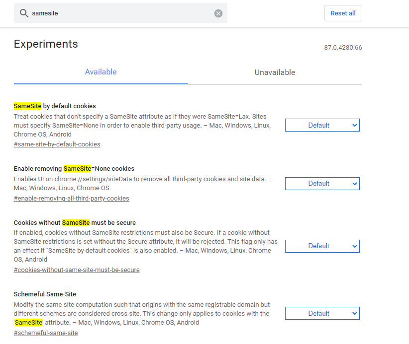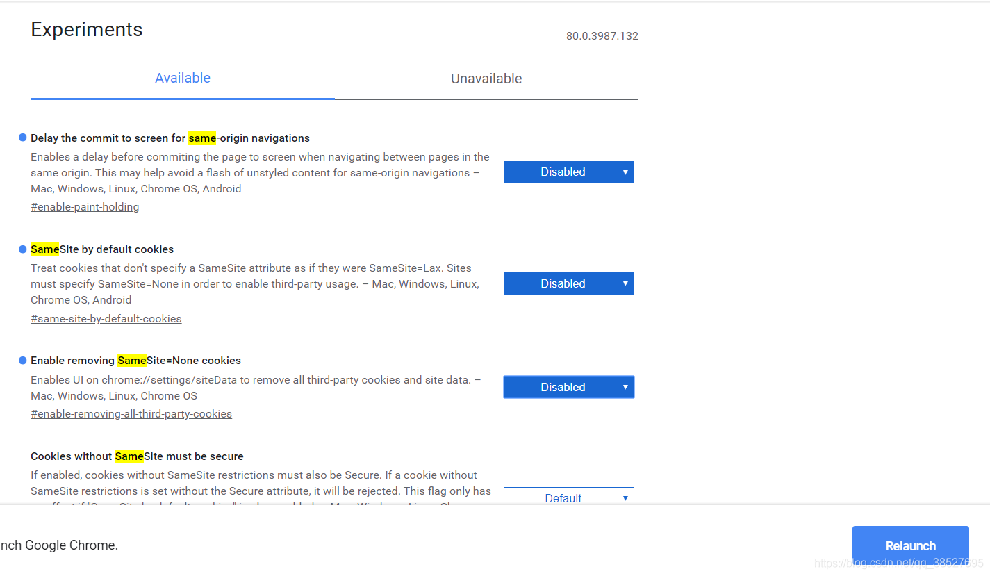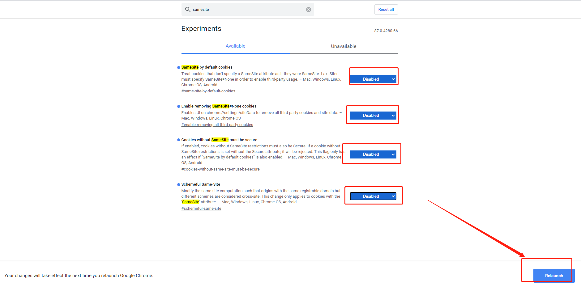 在chrome中打开链接: chrome://flags/#site-isolation-trial-opt-out,搜索samesite