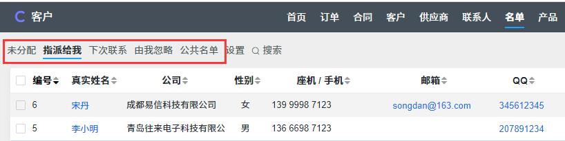 注:名单中的潜在客户被确认为客户后会显示在 crm-客户中,不能再转到 名单 下显示。